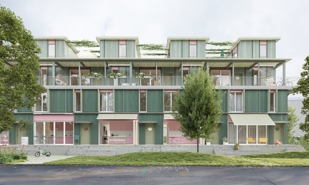 A total of 18 apartments (a mix of townhouses, duplexes and regular apartments) are split up between 2 buildings, which blend in with the existing structure of this industrial area at the outskirts of Zurich.