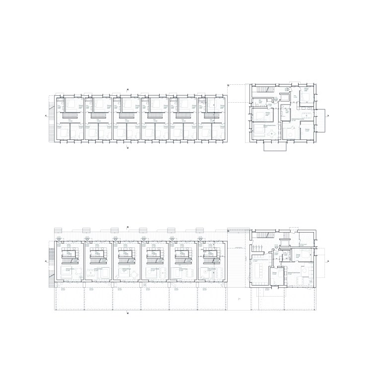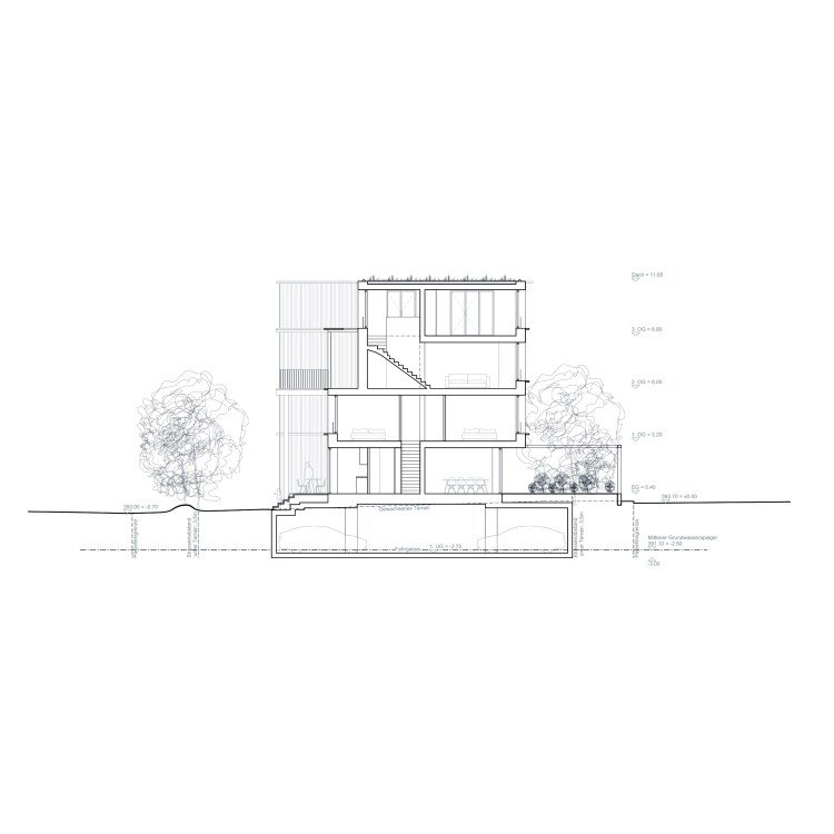 The complex acts as a catalyst for an otherwise poorly developed area: a raised ground floor (pushed up by the underground garage due to high groundwater levels), an access balcony towards the street in the North, a small pass-through with its adjacent laundry room as well as private gardens in the South… they all define different degrees of privateness and public space.