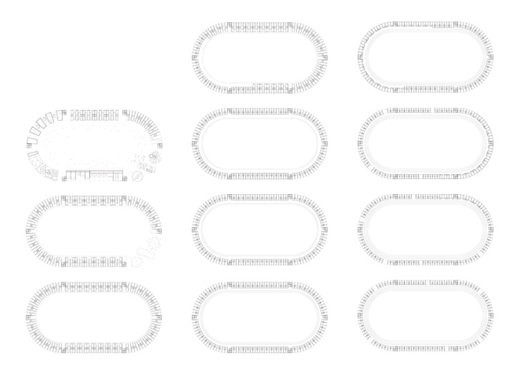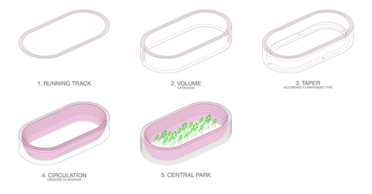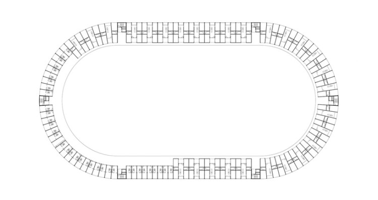 The borrwoing of form (here a running track according to IOC standards), offers a couple of interesting side effects, if applied to housing: a central park is created, around which the apartments are organized. On the inside, access balconies offer communicative spaces, a kind of streets in the sky, whereas the outside offers privacy with a view. The necklace-like linear arrangement guarantees each room a maximum amount of natural light.